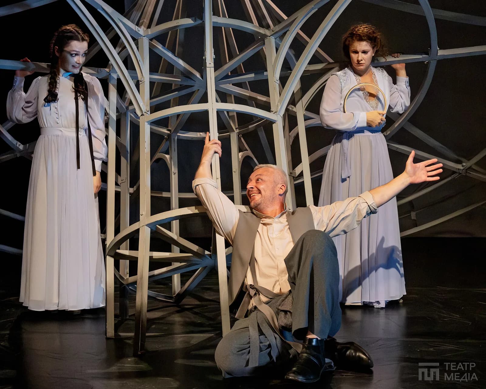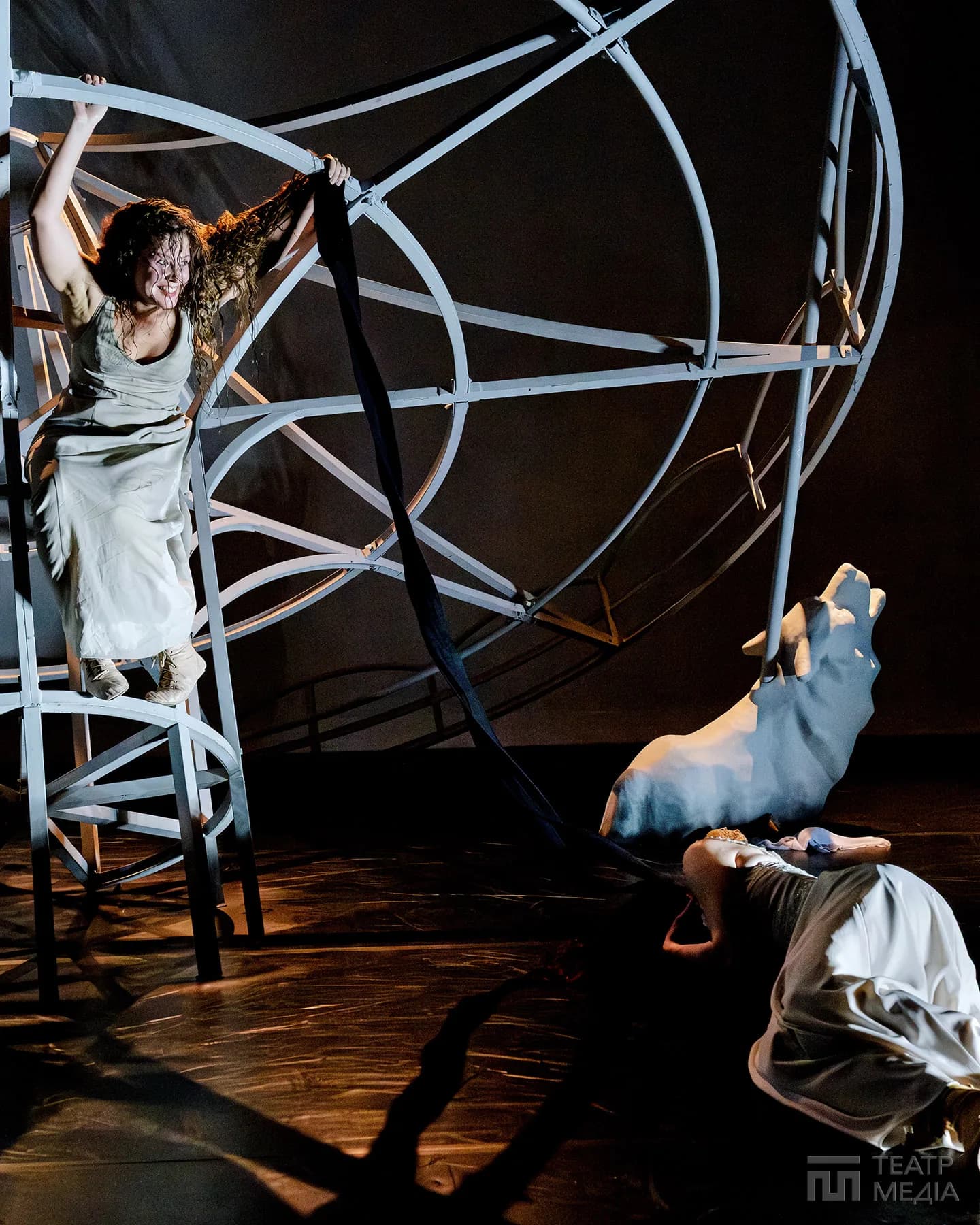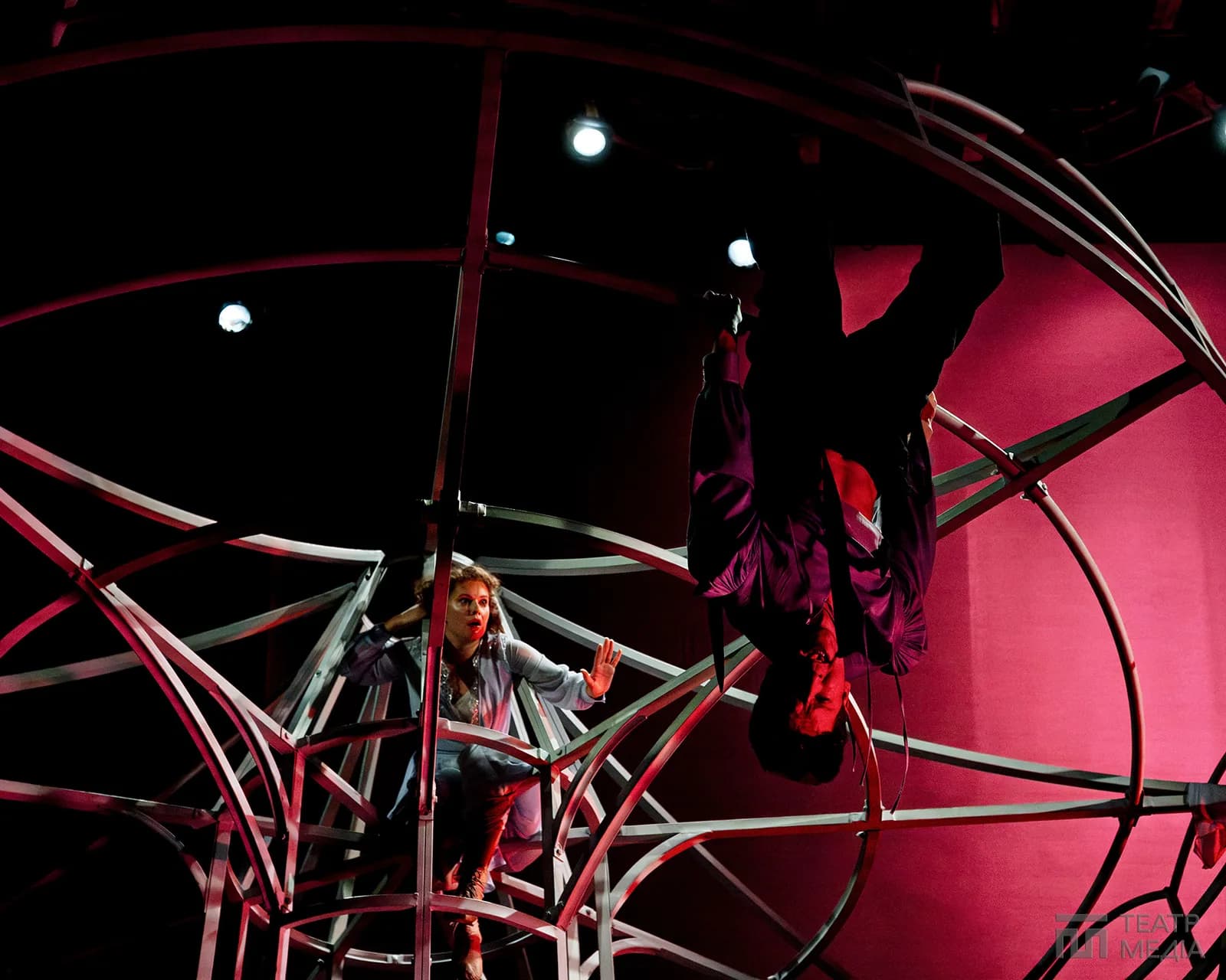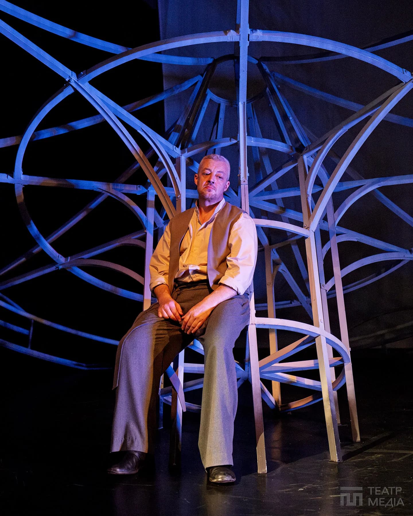 Театр Франка привчив нас до оригінальних сценічних рішень: екрани, пустелі Аризони, індустріальний арт-хаус. Цього разу значну частину простору сцени займає конструкція, схожа на похилену, зламану карусель. Статичну, металеву, холодну.