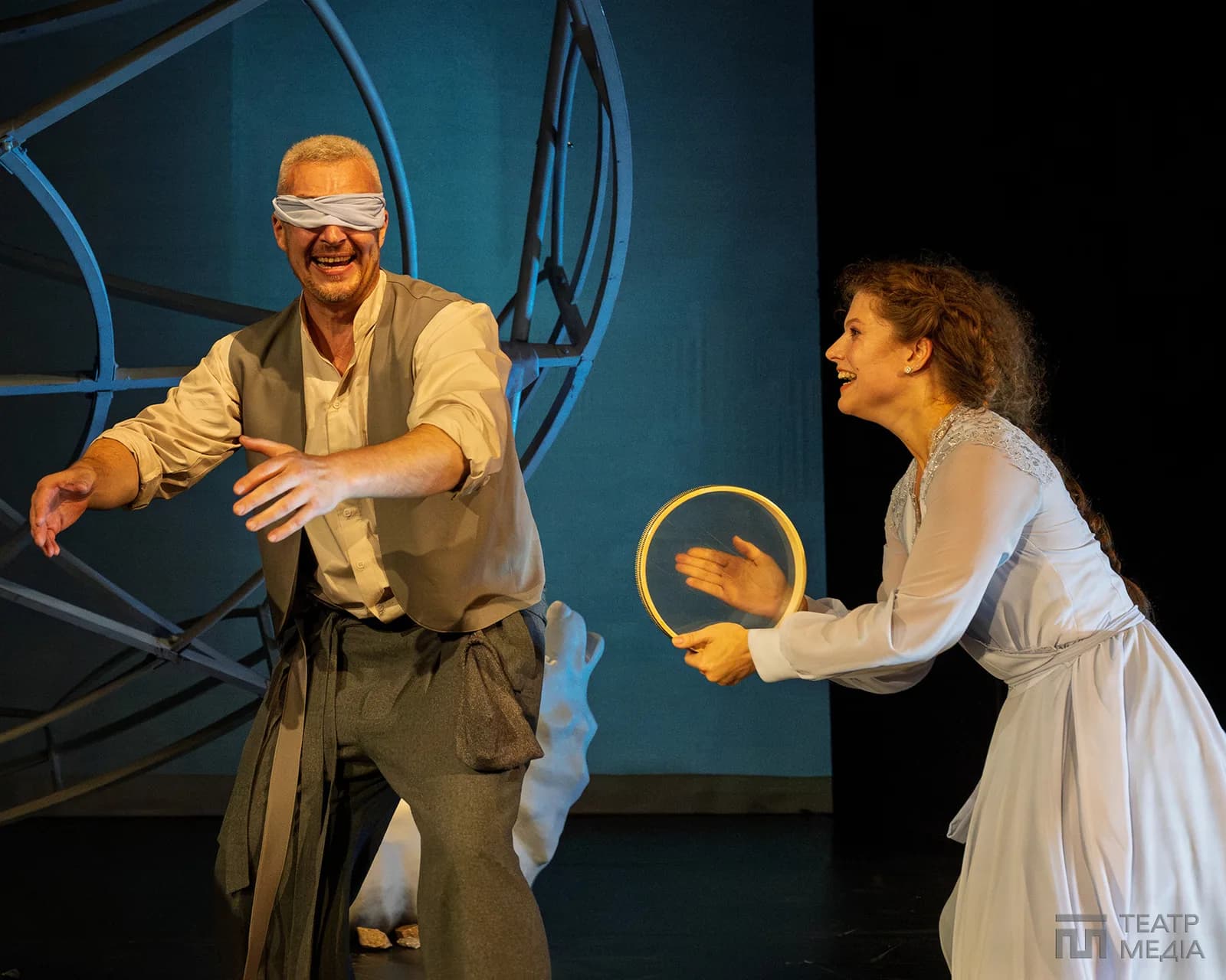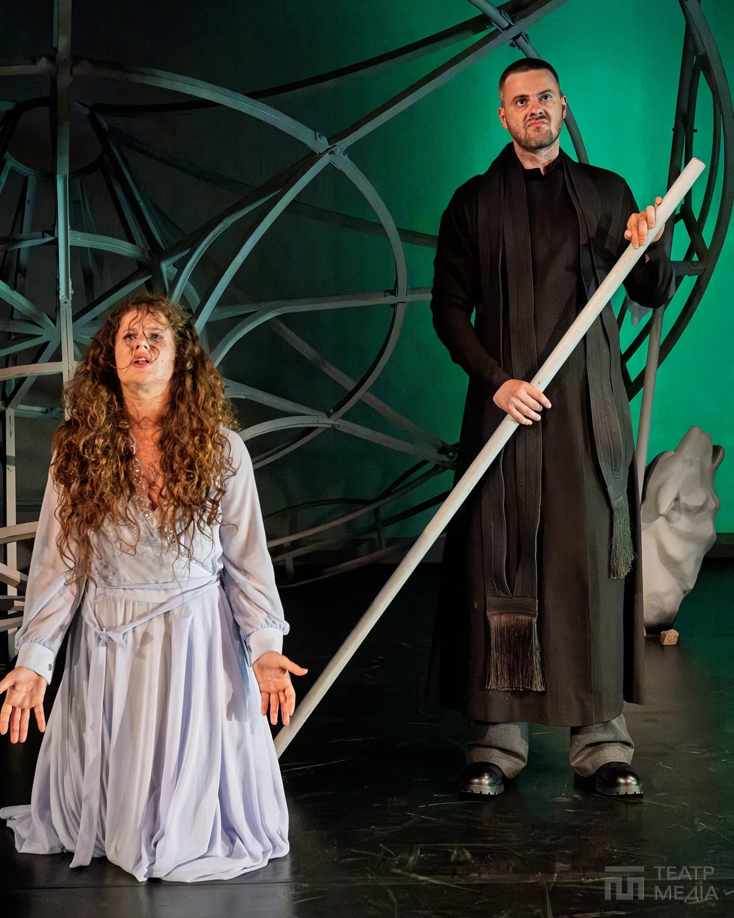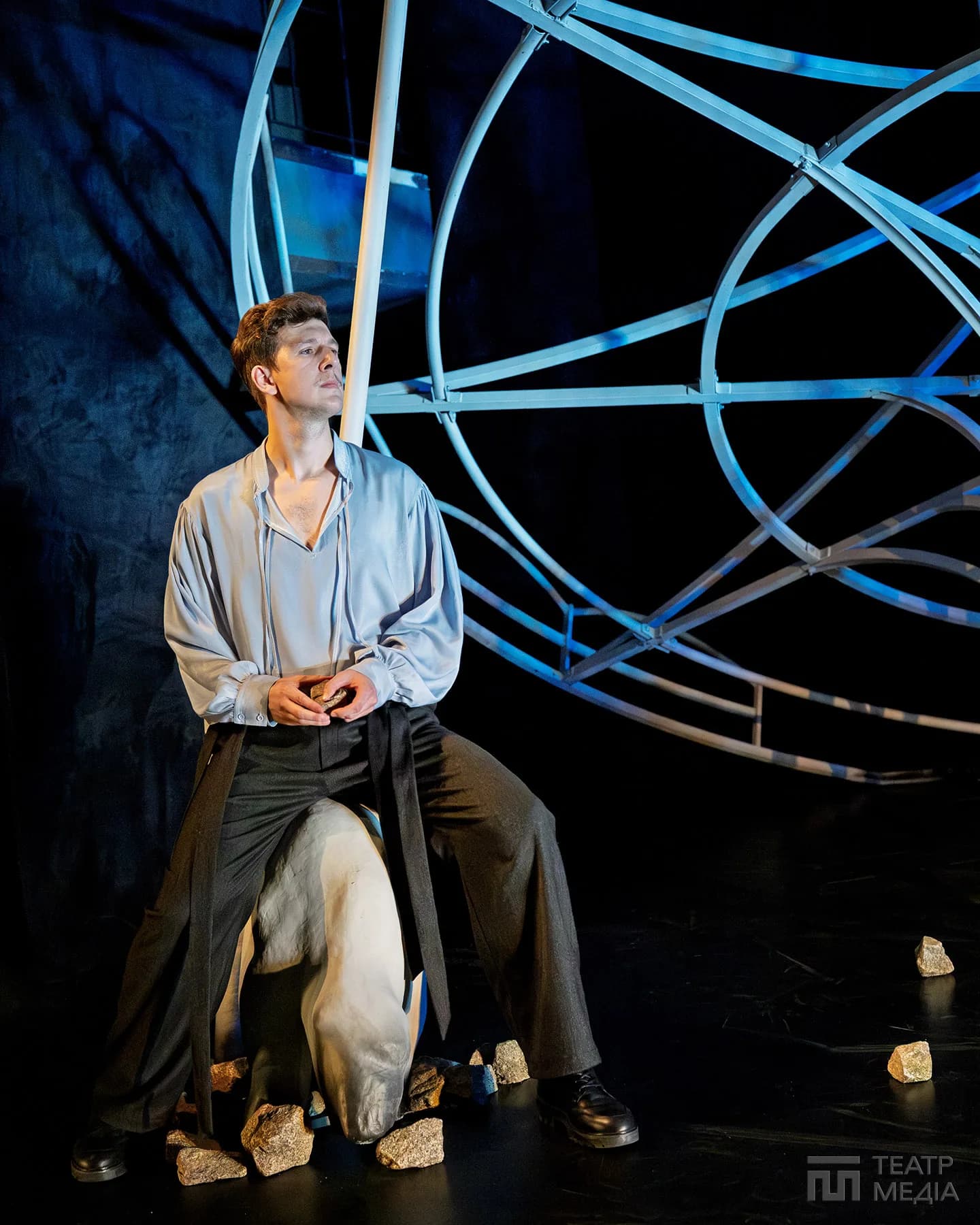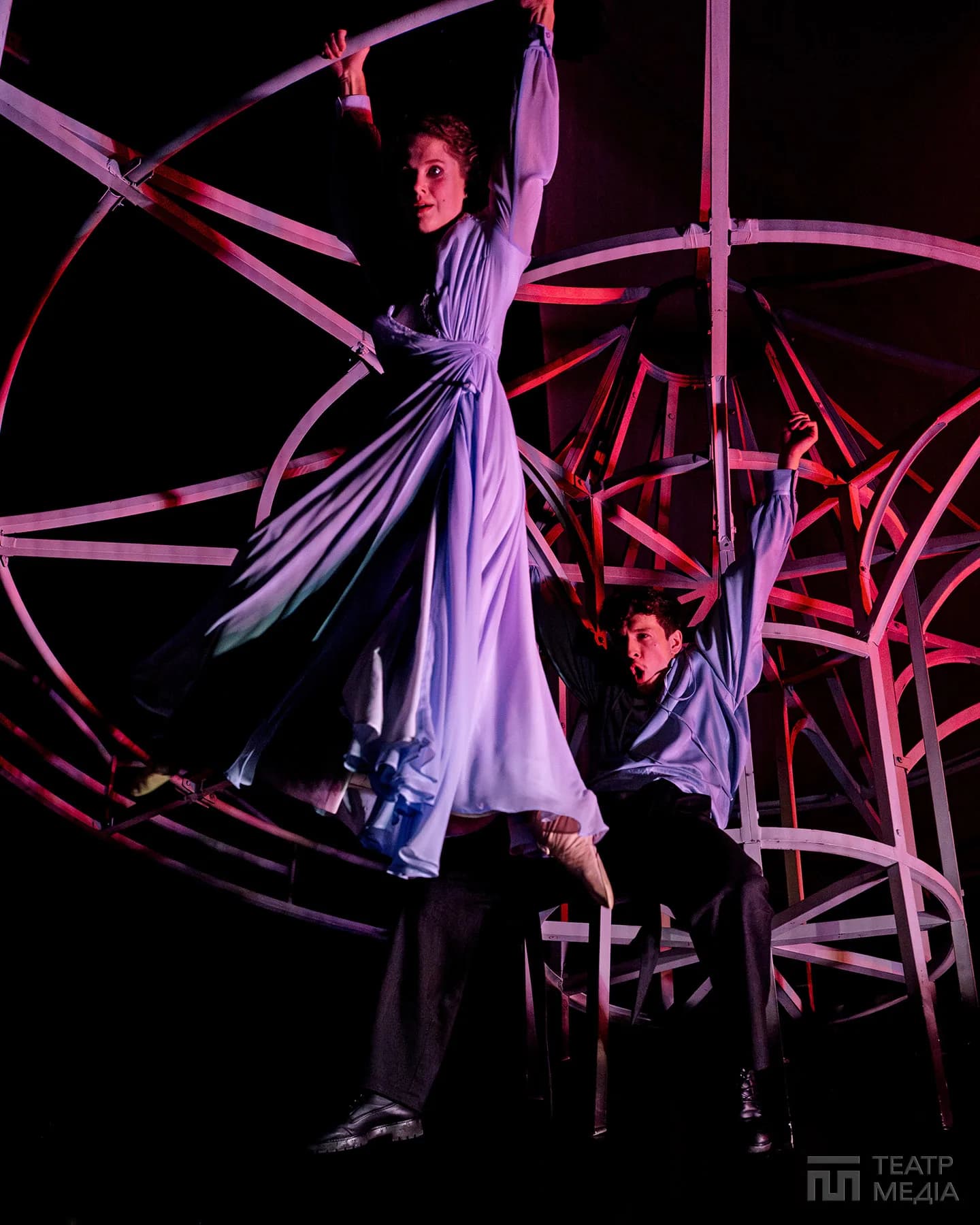 Театр Франка привчив нас до оригінальних сценічних рішень: екрани, пустелі Аризони, індустріальний арт-хаус. Цього разу значну частину простору сцени займає конструкція, схожа на похилену, зламану карусель. Статичну, металеву, холодну.
