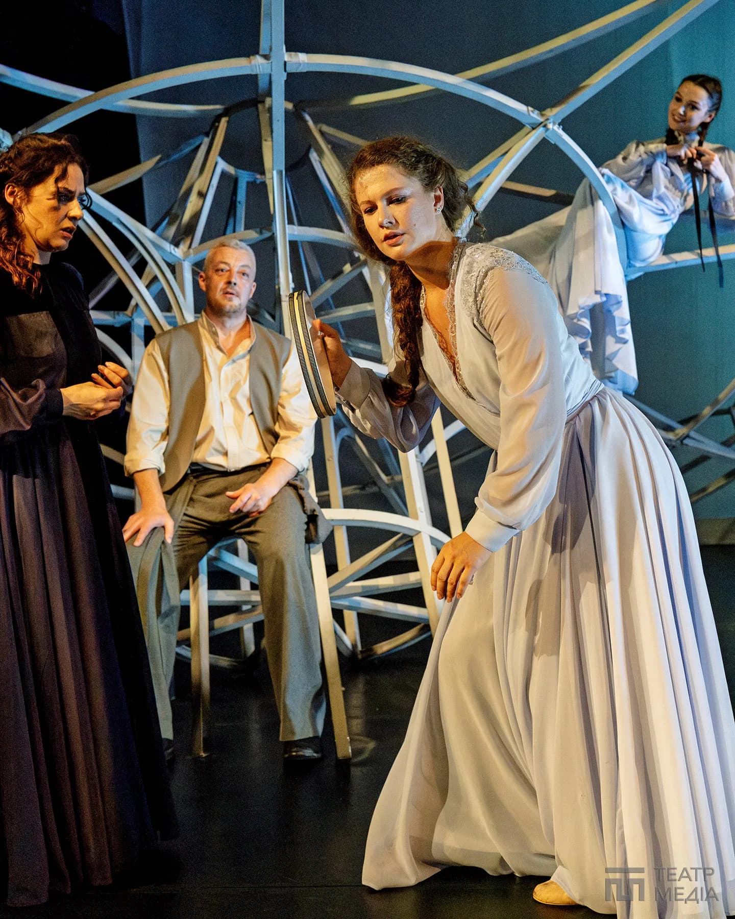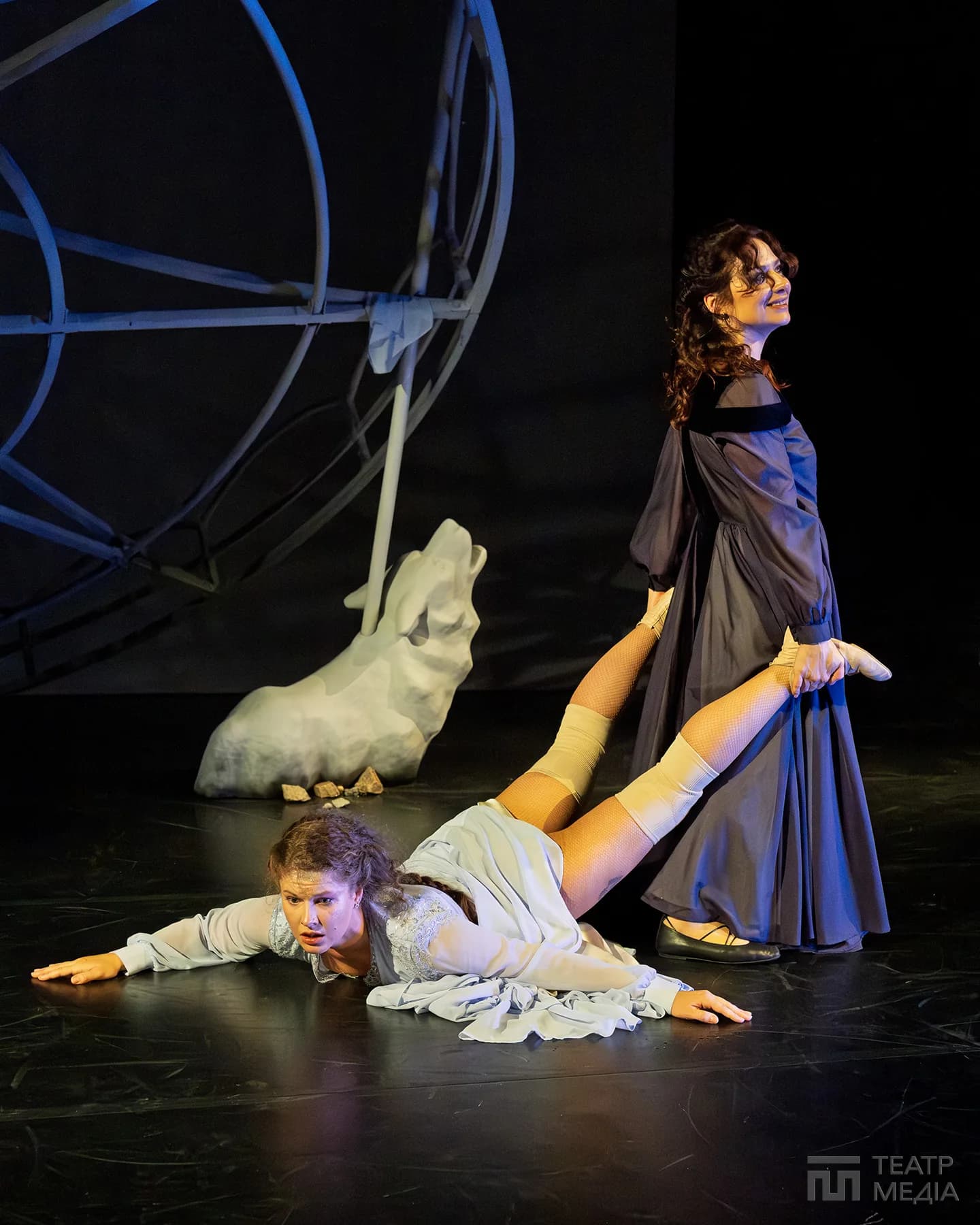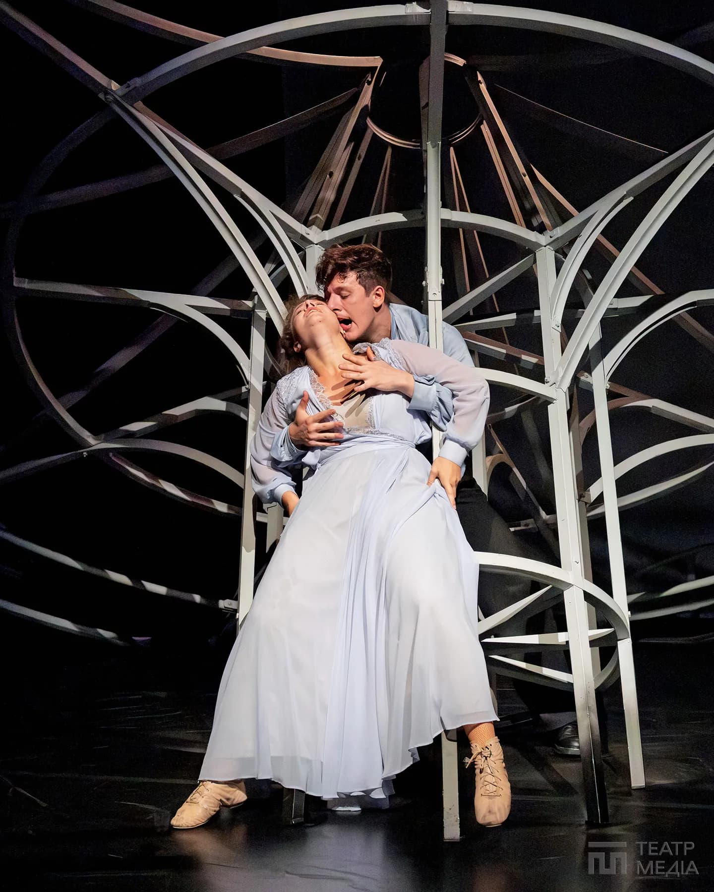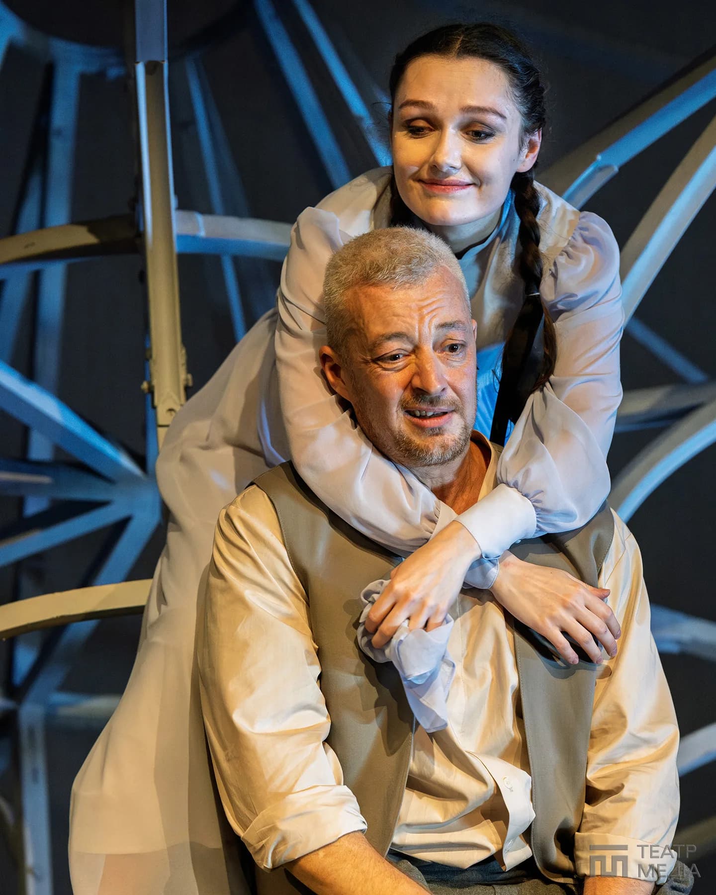 Театр Франка привчив нас до оригінальних сценічних рішень: екрани, пустелі Аризони, індустріальний арт-хаус. Цього разу значну частину простору сцени займає конструкція, схожа на похилену, зламану карусель. Статичну, металеву, холодну.