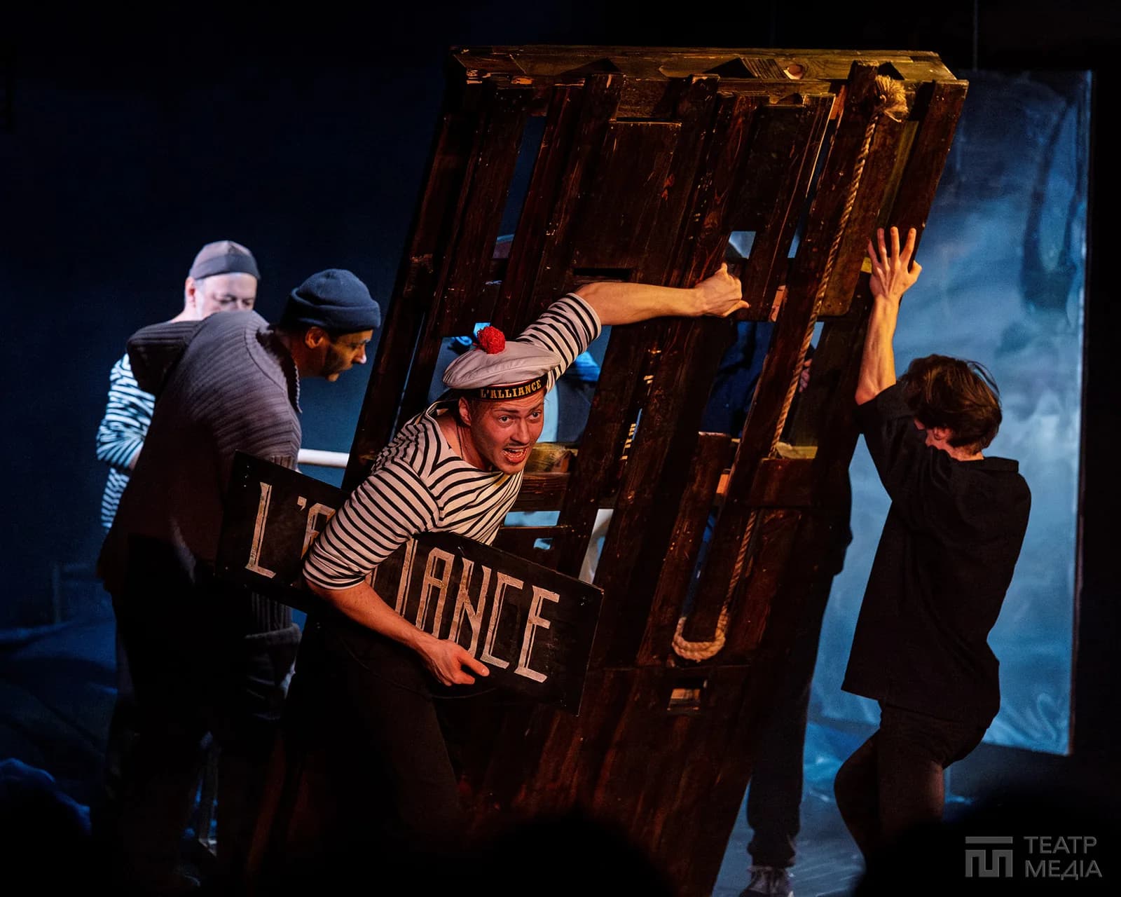 Пліт, який актори піднімають і тримають, стає символом спільного виживання, а водночас — хрестом, тягарем, театральною метафорою самої сцени, де актори утримують життя у нестійкій рівновазі.