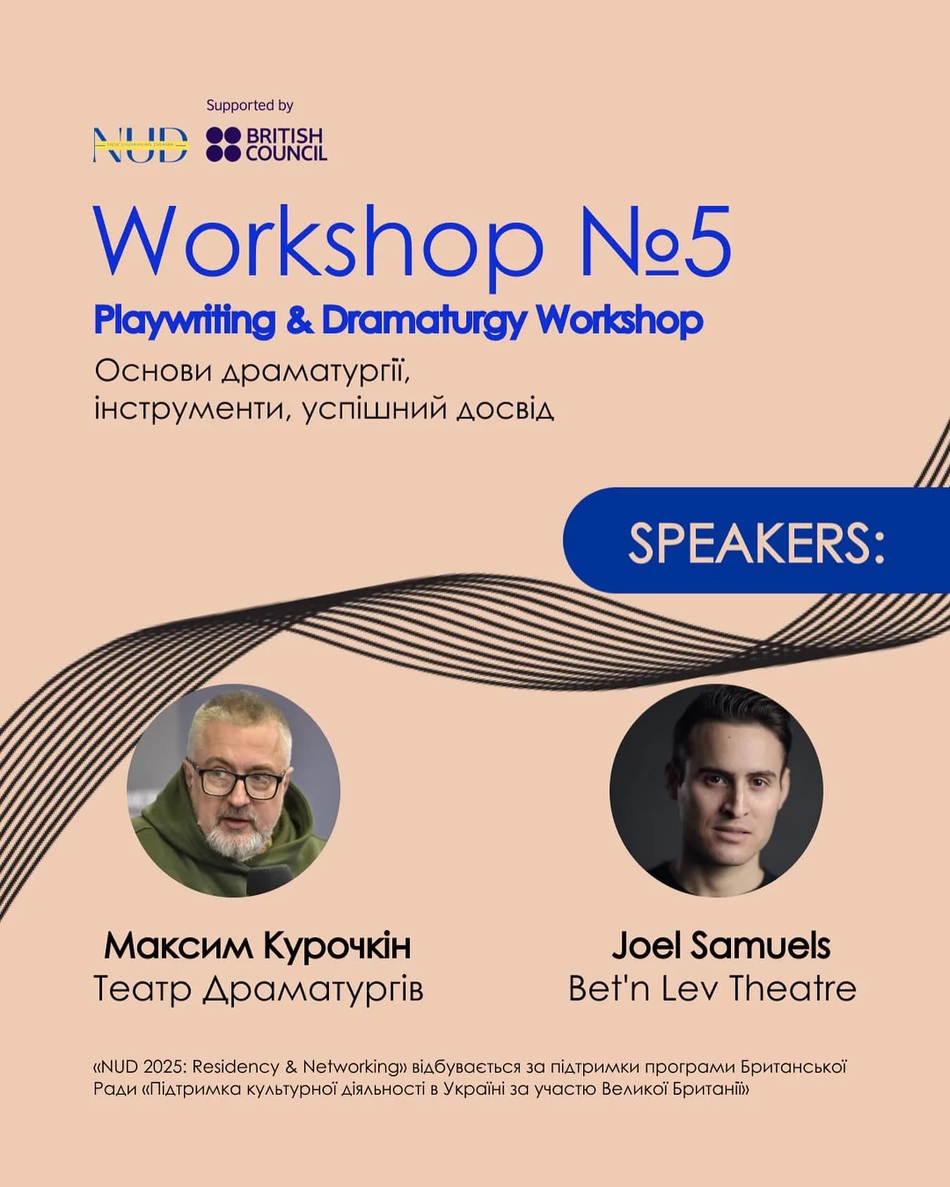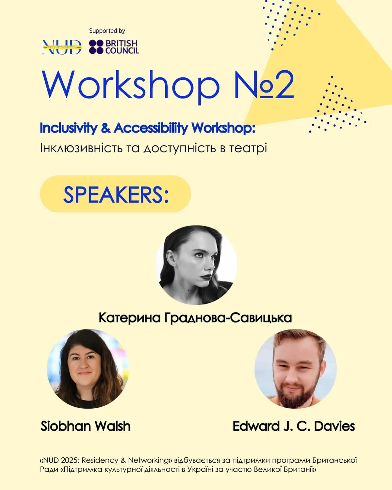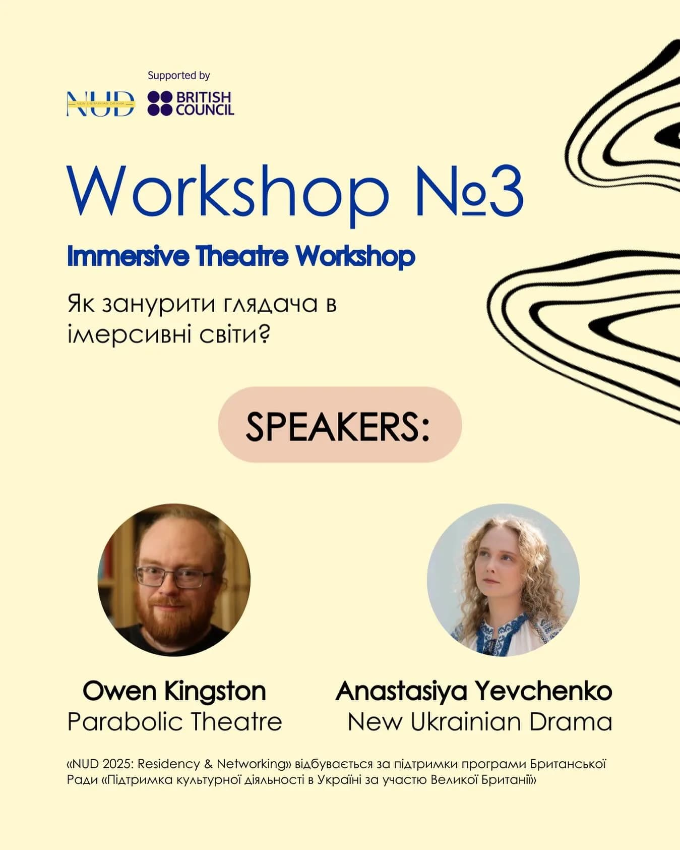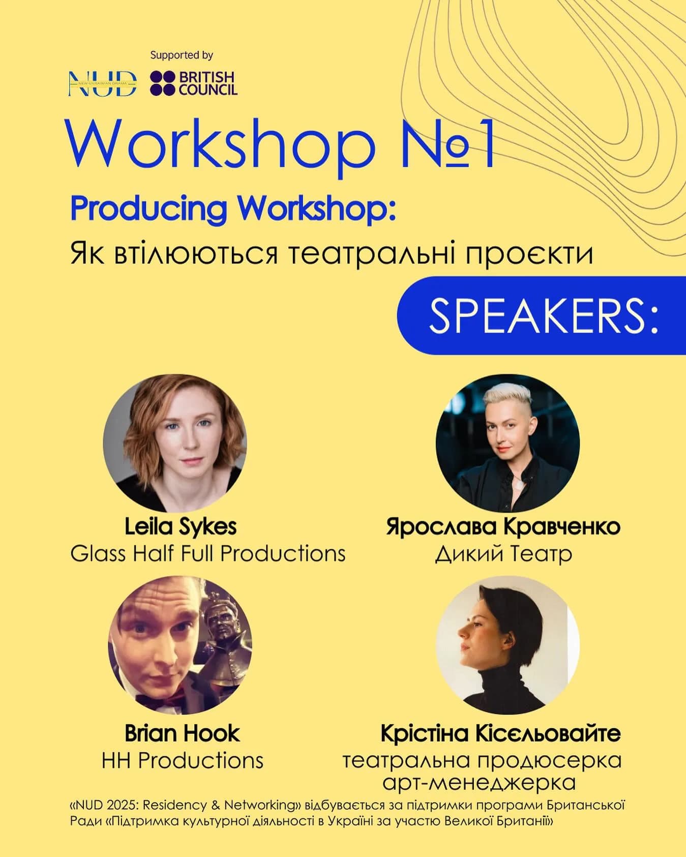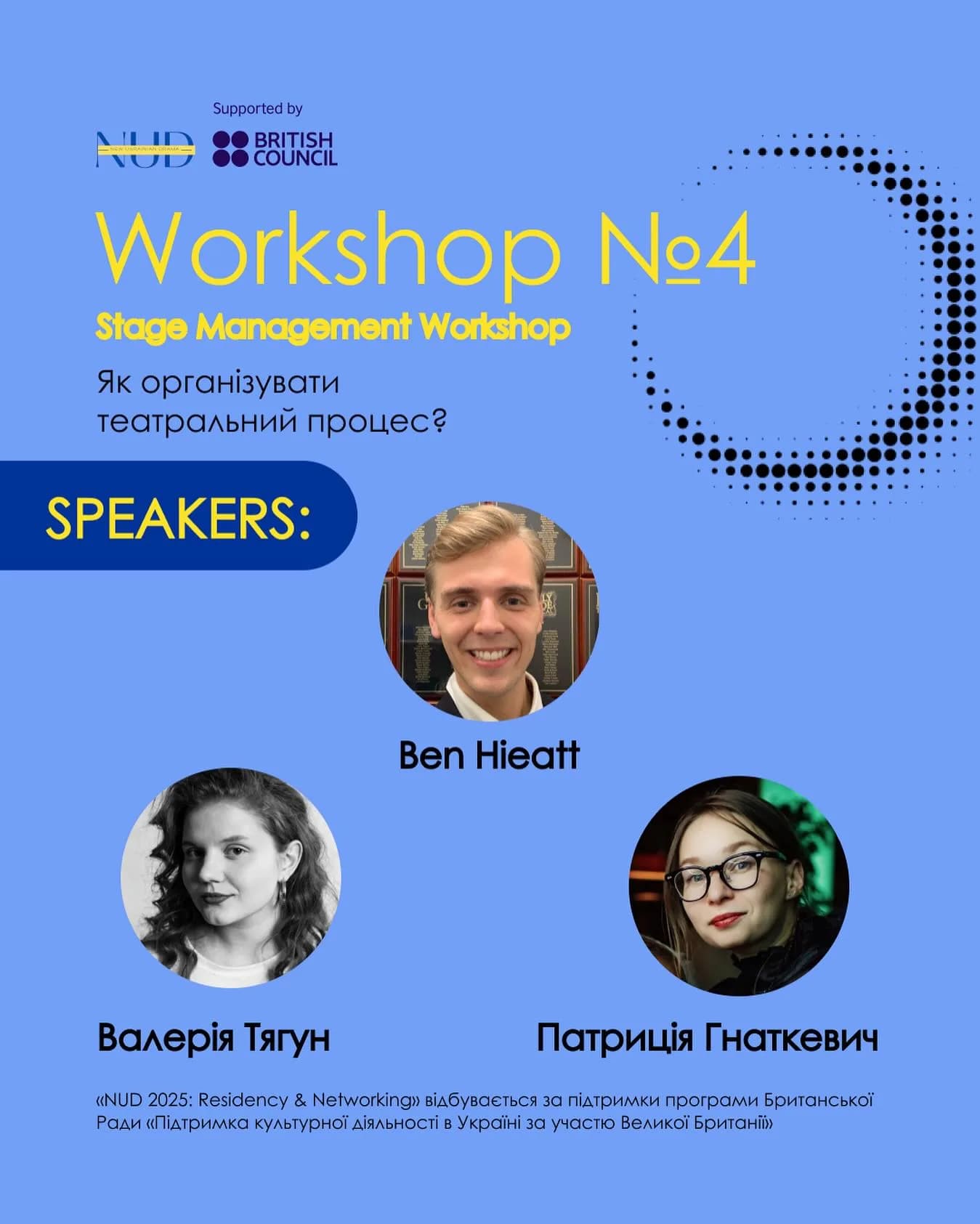 Протягом липня команда NUD провела серію з п’яти онлайн-воркшопів, які охоплювали такі теми, як інклюзивність і доступність, стейдж-менеджмент, драматургія, іммерсивний театр, міжнародне театральне продюсування.